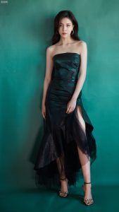 唐诗咏穿抹胸礼服配细高跟鞋翘二郎腿