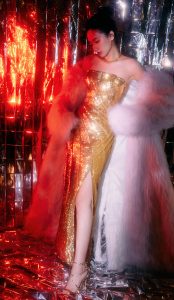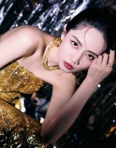 • 身材纤瘦的美人刘惜君穿金色连衣裙在