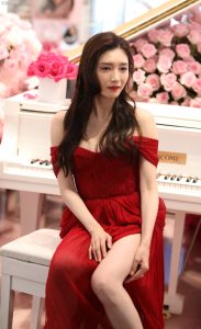 红唇欲动张靓颖穿分叉长裙跷二郎腿